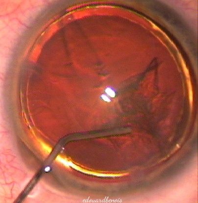 La canule (tuyau qui ne pique pas, par opposition à aiguille, tuyau qui pique) est introduite par la voie d'abord principale de 2,8 mm de large, réalisée au bistouri pré-calibré à usage unique. L'eau salée a ici investi deux limites de la structure concentrique du cristallin, offrant cet aspect étonnant de double anneau doré :