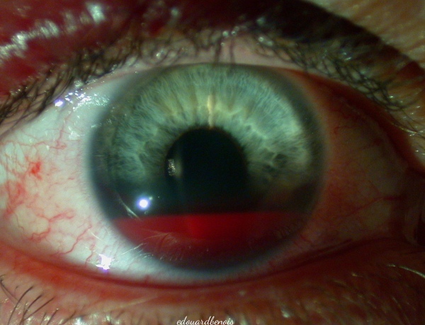 Hyphéma est une contraction d'hypohéma, qui signifie "en bas, sang". La première cause d'hyphéma est la contusion oculaire de gravité moyenne (traumatisme non perforant) ; ensuite (par ordre de fréquence), arrivent les traumatismes perforants, et le terrible glaucome néo-vasculaire (à son stade évolué). Ce monsieur s'est frappé son œil avec une petite bille de plastique dur enfilée à l'extrêmité de la fermeture élastique de son gilet. Le niveau liquide qui affleure la pupille est du sang, responsable d'une hypertonie oculaire, qu'il faut soigner vigoureusement afin d'éviter qu'elle endommage le nerf optique :