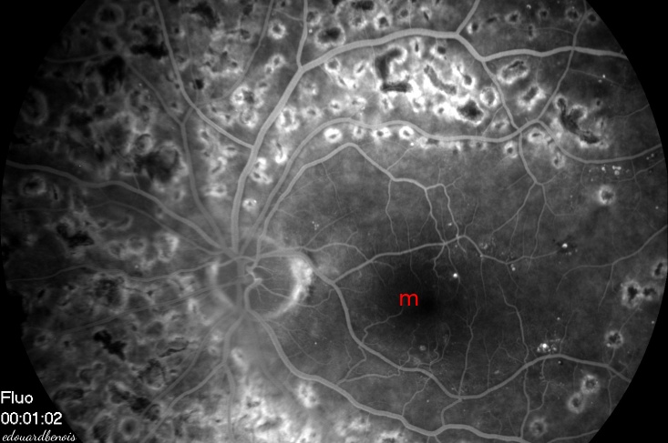 Les impacts de laser sont ces taches léopard qui entourent la plage centrale du fond de l'œil, où la macula apparaît comme une tache sombre.